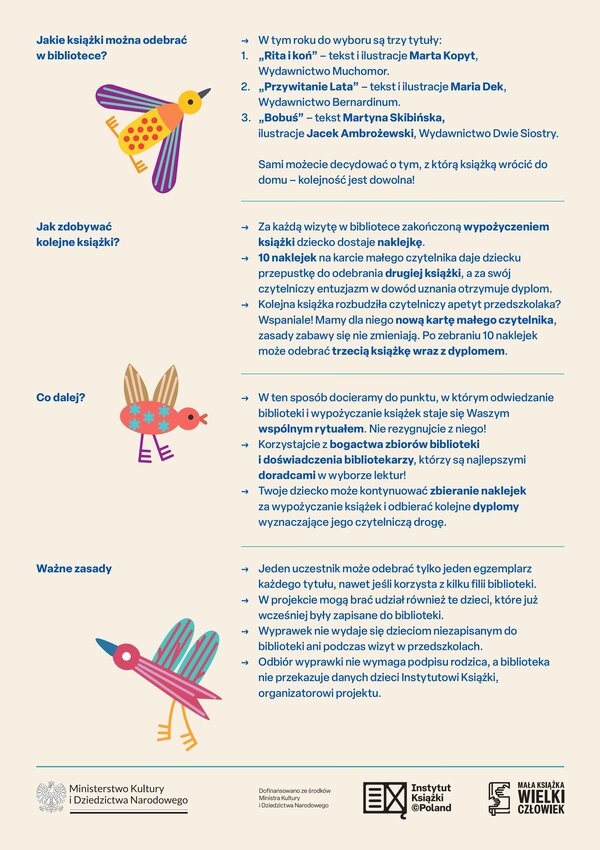 Każdemu przedszkolakowi, który odwiedzi naszą bibliotekę w towarzystwie rodzica lub opiekuna i zechce wziąć udział w akcji, wręczymy specjalną Wyprawkę Czytelniczą oraz Kartę Małego Czytelnika.