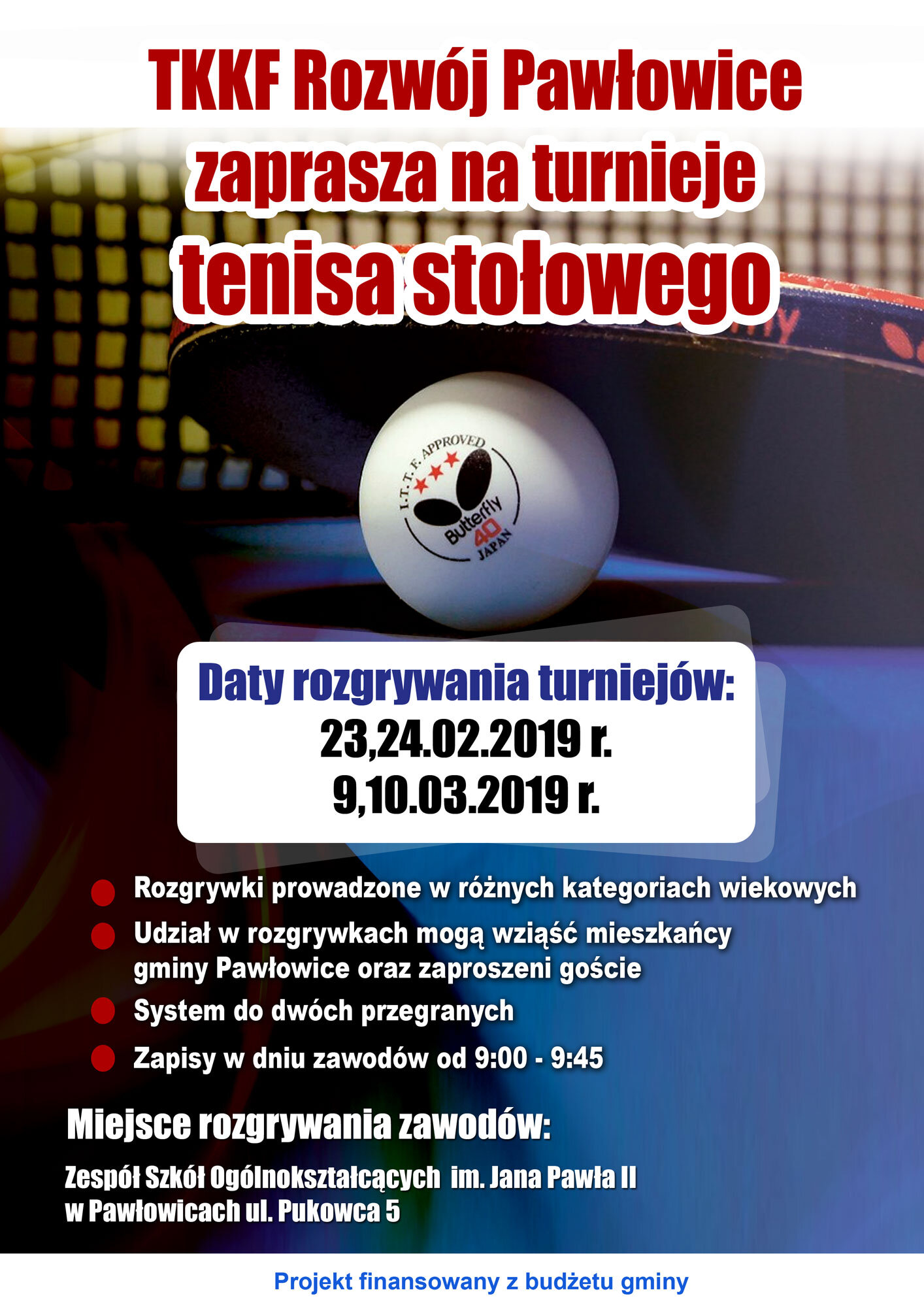 TKKF Rozwój Pawłowice zaprasza na turnieje tenisa stołowego. Zawody odbędą się w Zespole Szkół Ogólnokształcących im. Jana Pawła II w Pawłowicach, ul. Pukowca 5.